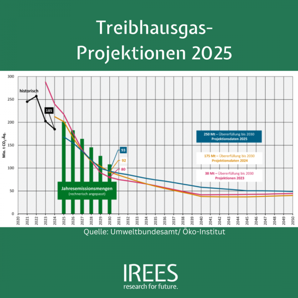 Die offiziellen Projektionsdaten2025 des Umweltbundesamt sind veröffentlicht. Die dahinter liegenden Rechnungen für den Gebäudesektor haben wir bei IREES GmbH, gemeinsam mit Oeko-Institut, durchgeführt.